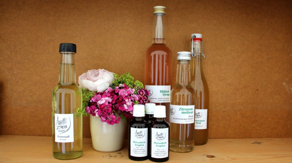 verschiedene Sirupe (Holunder, Blüten, Rosen, Waldmeister, ...) und Frucht-Liköre